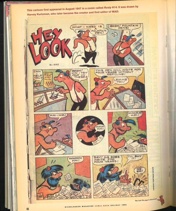 In December 2009 the Visual Arts Library received a generous donation from Dave Roman and Nickelodeon; a full run of Nickelodeon Magazine (1993-2008). Dave and Chris Duffy edited the comics section of the magazine which was a prominent feature in every issue. Sometimes they would feature a vintage comic, such as this one drawn by Harvey Kurtzman in 1947: